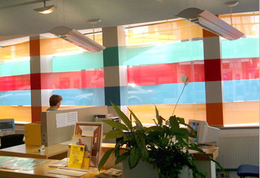 Durch eine Neugestaltung der Schaufenster in dem ansonsten denkmalgeschützten Gebäude wird eine besser Präsenz des Immobiliencenters der Gemeinnützigen Wohnungsgesellschaft Hessen erreicht. Die zwischen den Säulen „eingewobenen“ farbigen, semitransparenten Stoffbahnen schaffen eine freundliche Atmosphäre und stellen eine Beziehung zwischen dem Außen- und Innenraum her welche auch im Wechselspiel der Jahreszeiten funktioniert. Die farbige Megastruktur unterstützt die Fokussierung der Passanten auf die Präsentiertafeln der Wohnungsangebote in den Schaufenstern.