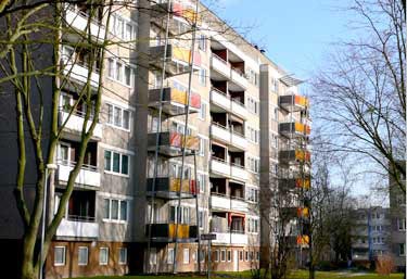 und Zweizimmerwohnungen der siebengeschossigen Wohnblöcke der Plattenbausiedlung