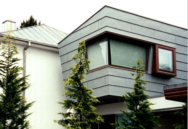 Holzrahmenkonstruktion mit einer Verkleidung aus vorbewittertem Titanzink. Die